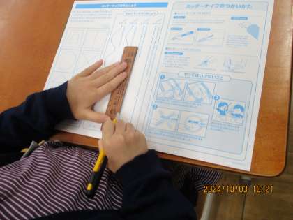 図画工作科では、カッターの使い方の学習を始めました。初めての使うカッターナイフに緊張していましたが、少しずつ上手く使えるようになってきました。次回から、練習ではなく作品を作っていきます。