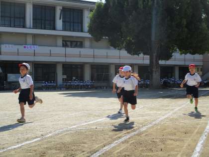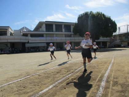 お天気も良い中、本日衣笠スマイル運動会が行われました。1年生にとって初めての運動会です。子ども達は、4列、2列、1列・・・と並び方から練習しました。たくさんの練習のおかげで、自信いっぱいで50m走、アイデア走、団体走に頑張ることができました。