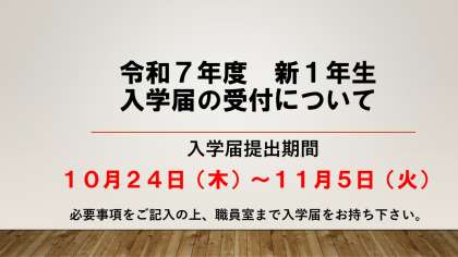 令和7年度4月にご入学予定の保護者の皆様、間もなく区役所より就学通知書と入学届がご自宅に届きます。入学届に必要事項をご記入のうえ、10月24日(木)〜11月5日(火)の期間に本校まで保護者の方が直接お持ちください。ご入学の手続きおよび書類の説明をさせていただきます。なお、私立小学校・国立小学校・支援学校等に入学希望の方、また転出予定のある方も、就学通知書に記載されている指定学校(住民票住所の指定学校:京都市立衣笠小学校)で一旦手続きをしていただきますので、必ず来校していただきますようよろしくお願いいたします。