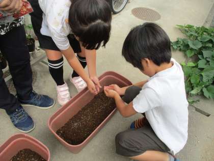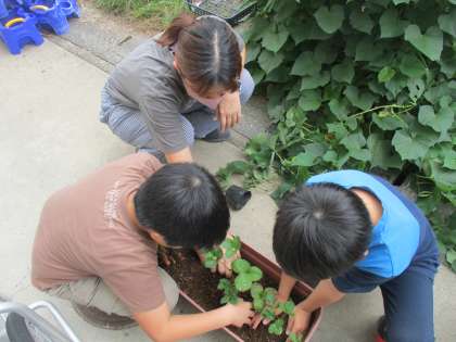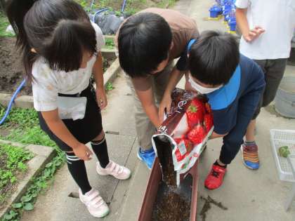 10月16日(水)、理科担当の先生にいただいたイチゴの苗を植えました。まず、プランターにイチゴ専用の土を入れました。重たい土をこぼさないように慎重に入れていました。半分入れたところで、イチゴ専用の肥料を入れました。さらに土を上から入れて土の準備は完了しました。それから間隔と深さを考えてイチゴの苗を植えました。苗を植えるときに理科担当の先生に、真ん中の芽が土の中に埋もれてしまわないように気を付けることを教えていただきました。最後に水を撒いて終わりです。初めてのイチゴの栽培です。うまくいくように取り組みたいと思います。