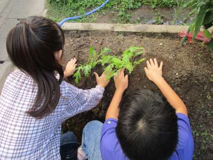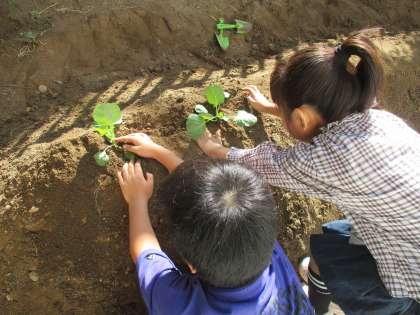 10月21日(月)、秋のもったい苗を植えました。今回は、水菜とキャベツとブロッコリーです。水菜の葉はギザギザでよくわかるのですが、ブロッコリーとキャベツの葉はとてもよく似ていて区別がつきません。区別の仕方を教えてもらったのですが、それでも自信をもって区別することはできませんでした。子どもたちは慣れた手つきでポットから苗を出して植えかえていました。よく似たブロッコリーとキャベツがどのように成長していくのか楽しみです。