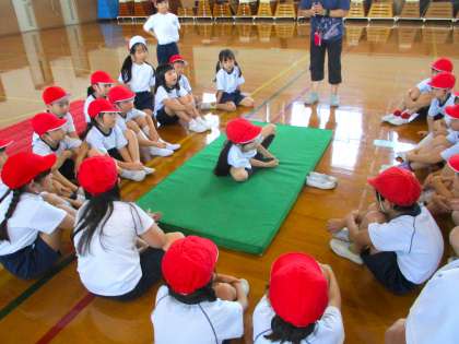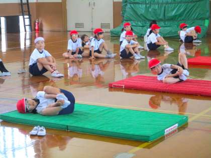 足をつけたまま体を倒して転がるのは意外と難しいものでしたが、どのように体を使うとうまく起き上がれるのか、考えて何度もチャレンジする1年生の子どもたちでした。
