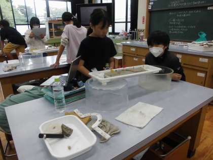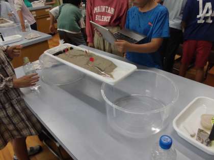 今回はすな場ではなく,各グループに分かれて実験できるように小さい実験セットを用意しました。水の量を変えて,はたらきがどう変化するのか確かめました。