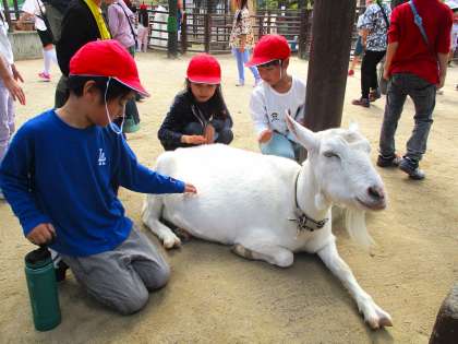 動物園につくとまず「おとぎの国」エリアで、山羊と触れ合う体験をしました。山羊に初めて触る子たちもいて、ドキドキしながら山羊の背中に触れる様子が見られました。ただ、触ってみるとかわいさが実感できたようで、「ふさふさやなあ。」「なんかきもちいいわ。」という声も聞こえました。
