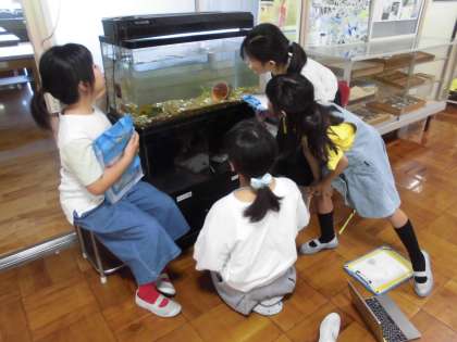 子どもたちは,自分が1年間観察する動物を春に決めています。秋になってその動物がどんな様子をしているか,観察をしました。夏に調べたときは,暑すぎて,日陰にもなかなか虫が見つからなかったりしたくらいでしたが,今日はたくさん見つけることができました。元気に泳ぐメダカの様子や,大きく育ったカブトムシの幼虫も目を輝かせて観察していました。