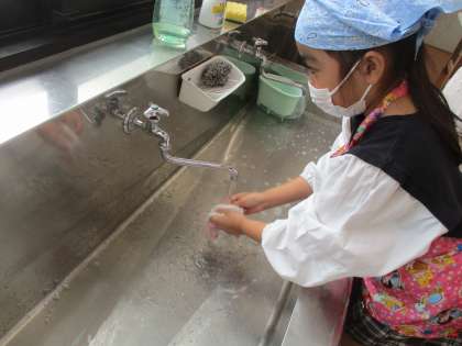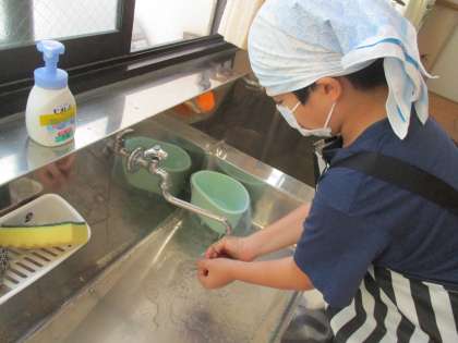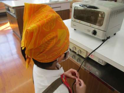 10月24日(木)2時間目、サツマイモの調理実習をしました。みんなで何を作るか話し合ったときに、やきいもの希望が多かったので。やきいもを作りました。まず水で丁寧に洗い、アルミホイルで包みました。アルミホイルを切るときは、サツマイモの大きさを見て、包める大きさを自分で考えて切りました。包んだ後は隙間がないかしっかりチェックしました。オーブントースターに入れて5分間加熱しました。みんな出来上がりが楽しみなようでした。5分後、見てみると中心がまだできていないようなのでもう5分間加熱しました。いい香りが漂ってきて待ちきれないようでした。オーブントースターから取り出して、自分のお皿に置き、熱いので気を付けながらアルミホイルをはがすととても美味しそうなやきいもが出来上がっていました。中はホクホクでみんなよろこんで食べていました。簡単にできるので「家でやってみる!」と言っていました。後片付けもしっかり自分たちでして、楽しい調理実習になりました。