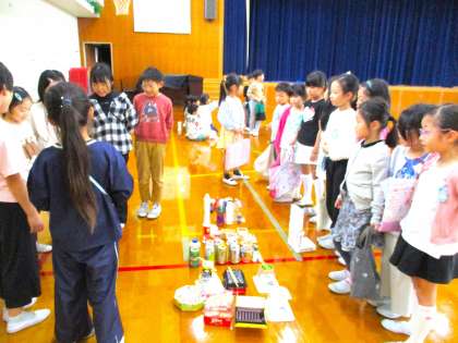10月28日(月)に,2年生から招待を受けて、1年生の子どもたちは体育館へ向かいました。体育館に入ると、手作りのおもちゃがたくさん!!2年生がペットボトルや空き箱、ストローなど、身の回りのものから工夫して作り上げたおもちゃが並んでいました。