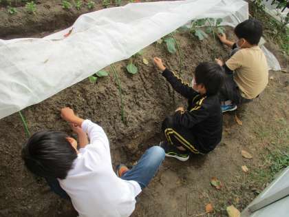 先日、キャベツとブロッコリーを植えました。そしてもったい苗の学習をしたときに、葉の裏に虫がつくことを教えていただいたので、葉の裏をチェックするようにしていました。11月1日(金)にチェックした時には、虫はついていなかったのですが、連休明けの11月5日(火)に見てみると、チェックするまでもなく葉が食べられていました。このままではいけないのでみんなで丁寧にチェックして、見つけた虫や卵を取り除きました。しばらくしっかりチェックしていこうと思います。