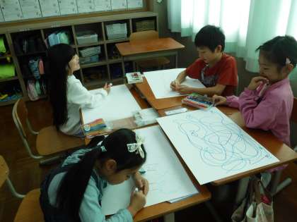 図画工作「せんのぼうけん」の学習で、ペンを使ってかいた線から、更に想像を広げて絵に表しました。絵は、クレヨンやパス、コンテを使って冒険の物語をかきました。「かくかく」、「にょろにょろ」、「でこぼこ」、「ながいながい線」の冒険はどんな世界が広がったのでしょうか。