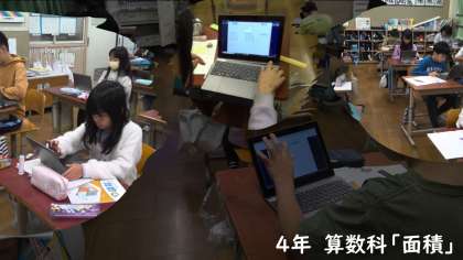 算数科「面積」の学習で、L字型の複合図形を分割したり、補完したりして、長方形や正方形の面積を求めました。