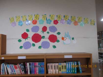 図書館ボランティアのぽぽんたさんがプール棟の二階のコーナの壁面を季節に合わせて変えてくださっています。このコーナーでは、高学年の児童が本を読んだり友達と話をしたりする姿が見られます。
