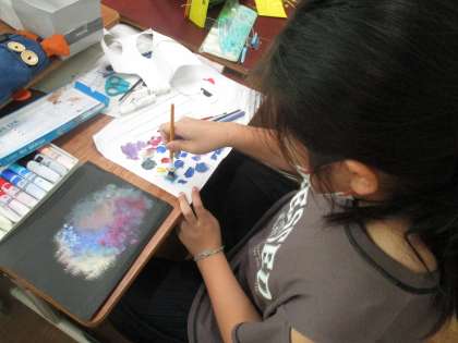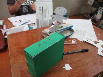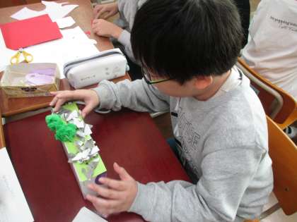 図画工作科の学習では、クランクの仕組みを生かしたおもちゃを作っています。クランクを回してみて想像した動きから、なんとか自分のイメージを作品に表そうと、頑張っています。