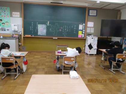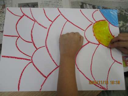 図画工作の時間、今日は「ゆめの木」を描こうというめあてでしました。クレパスで魚のうろこのような模様を描きます。それに色をつけてその後、黒のクレパスで真っ黒にします。その後は、お楽しみ。