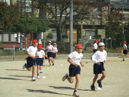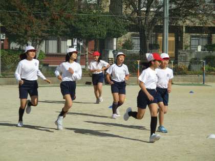 体育科の学習ではジョギングに取り組んでいます。「楽しく気持ちよく走る」をめあてに、自分が無理なく走り続けることのできるペースを設定しがんばっています。