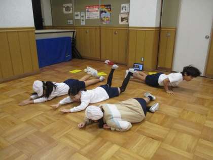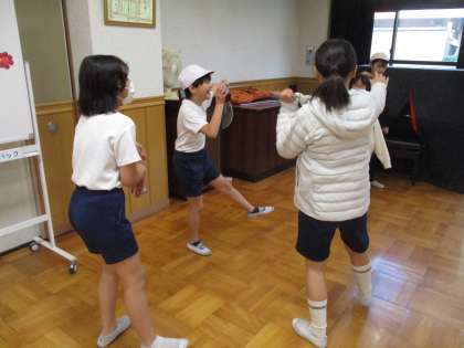 「表現」の学習では、創作ダンスを学習しています。今日はグループごとに四季の中から一つの季節を選び、曲に合わせて動きを考えました。どのグループもあれこれとアイデアが出て、大いに盛り上がり、楽しみながら動きを考えることができました。