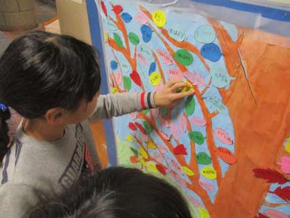 衣笠小学校の全校児童がそれぞれに考えた一言が葉になり、1本の木「ポジティブツリー」になります。一言一言に、あたたかい思いが込められています。