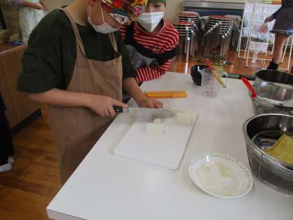 調理実習でごはんとおみそ汁をつくりました。だしからとったおみそ汁の味は絶品で、「おいしい!」という歓声があちこちから聞こえてきました。お鍋で炊いたごはんも程よいおこげがついてたいへんおいしくできあがりました。