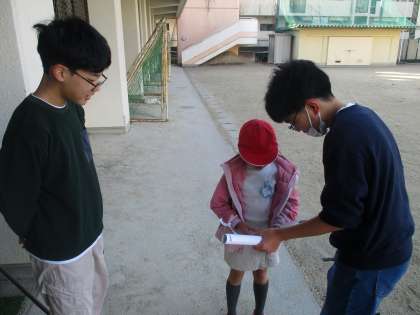 第2弾は、逃走中です。逃走者は、ハンターから逃げつつ、運動場に隠されたミッションを解きます。逃走中グループは、ミッションの内容を考え、難易度はどうか、分かりやすい文章かを話し合いながら進めていました。思ったよりも捕まった人が多かったので、捕まった人数によって、解放人数を変え、臨機応変に対応していました。