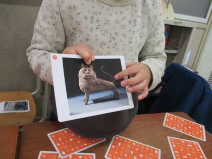 アートカードを使ってトランプゲームと同じように神経衰弱をしました。ただし、ルールを少し足して、カードが取れた後、その作品の素敵なところを発表しないと自分のカードとしてもらうことができません。みんなカードをみながら作品の素敵をみつけていました。