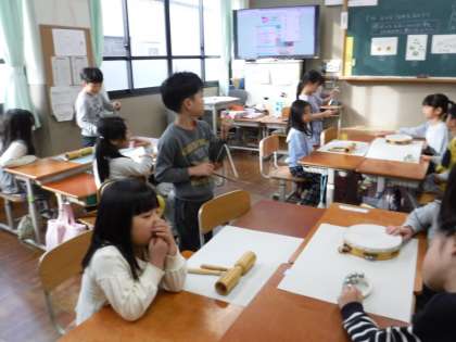 トライアングルやすず、ウッドブロック、タンバリン、カスタネット、5種類の楽器に触れ、演奏の仕方によって音色の変わる様子や面白さ、美しさを感じ取りました。