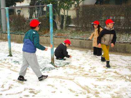 10日(金)は、朝から雪模様でした。生活科「ふゆと ともだち」の学習をするのにぴったりのお天気ということで、1時間目に運動場に出て、「ゆきあそび」を行いました。