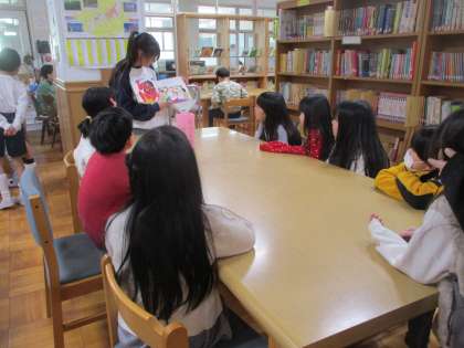 今日の中間休み、図書委員さんが低学年に読み聞かせの会を開きました。1,2年生がたくさん来てくれて、笑い声も聞こるなごやかな雰囲気でした。