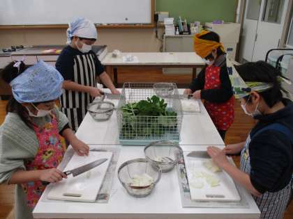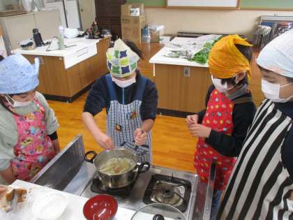 一生懸命に育てた大根を収穫して、味噌汁を作りました。包丁の使い方を知るとだんだん上手に切れました。味噌をといて大根の葉もいれて出来上がりました。大根がやわらかく,とてもおいしい味噌汁になりました。「大根がやわらかい。」「味噌汁の汁もおいしい。」とみんな大喜びでした。