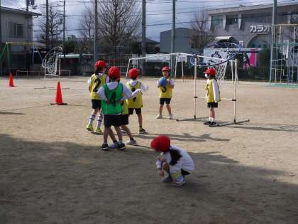 今週より、体育科では「パスゲーム」の学習を始めました。ボールを投げる・受ける練習をした後、6つのチームに分かれてコートを作りました。初めての作業なので不安そうでしたが、一生懸命コートを作ることができました。コートを作った後はゲームをしました。寒さもふっとぶほど楽しいゲームをすることができました。
