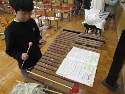 音楽科では「茶色の小びん」という曲の合奏練習をしています。グループ発表に向けて、それぞれに担当する楽器を決め、教え合いながら活動しています。音を合わせるのがなかなか難しいです。