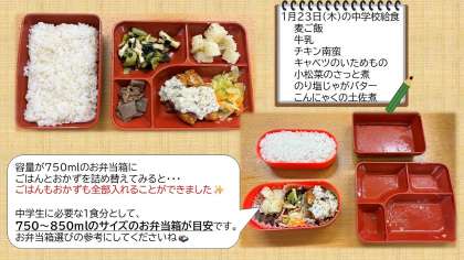 1月23日(木)に、中学校給食の試食をしました。初めは、栄養教諭の先生から中学生が成長するために必要な食事量や中学校給食についてのお話を聞きました。自分がいつも使っているお弁当箱の容量を確かめてから、お弁当に移し替えていく作業に取り掛かりました。