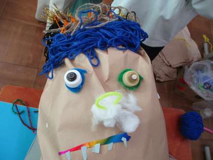 クラフト紙に新聞紙を詰めて、袋を「ぎゅっ」としばって鬼の角を作りました。大きな鬼の顔を作っています。髪の毛や眉毛、目など色々な部分の装飾をしています。少しずつ装飾がふえて出来上がりが楽しみです。
