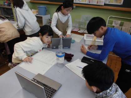 あっという間に氷に変化していく中,記録と観察をしなければいけません。大慌てでした。実験が終わり,実験の結果をエクセルでグラフ化し,温度の変化と水のようすにはどんな関係があったか,みんなで話し合いました。