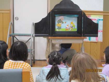 20日(木)読み聞かせボランティアのぽぽんたさんの今年度最終の読み聞かせがありました。低学年向きでしたが、6年生も聞きに来てくれていました。紙芝居の台を使って2冊読んでくださいました。1年間ありがとうがざいました。