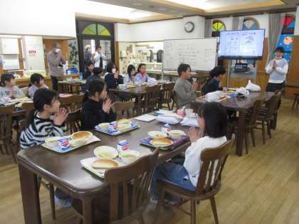 竹中先生からお話いただいた後、ランチルームで給食を食べました。ランチルームでの給食をとても楽しみにしていた子ども達です。いつもとはちがった雰囲気で、会話を楽しみながらおいしくいただきました。