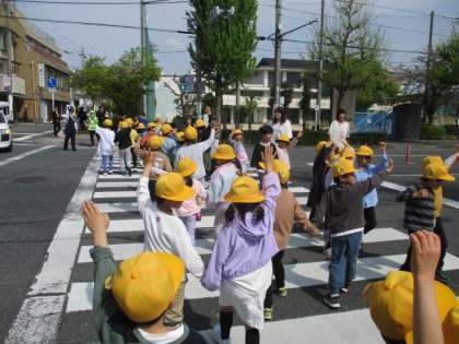 実際に、学校の正門や、西大路通りの横断歩道を使って、安全に横断する練習も行いました。