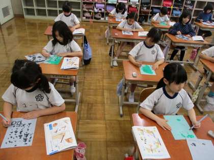 書写の時間に水書シートをつかった学習にチャレンジしました。姿勢や持ち方を確かめた後、どんなふうに書くことができるか、やってみました。点々やなみ線、イラストなど水書の感覚を味わいながら楽しみました。