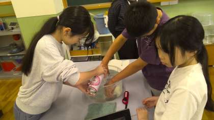 水の中でびんの空気をぬき,それぞれの気体だけになるように,ボンベで気体を入れました。この作業がなかなか難しく,6年生は苦戦していました。