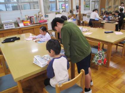 教えてもらった1年生も、教えてくれた6年生もニコニコ笑顔になった雨の日の図書館でした。