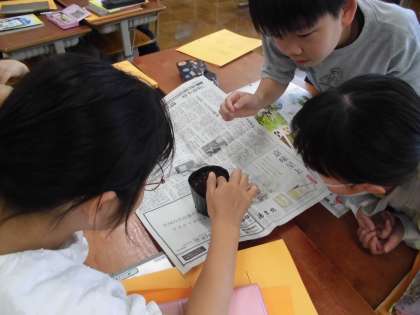 ヒョウタンのタネを,ポットに植えました。誰が指で土に穴をあけるのか,誰がタネを置くのか,話し合って決めていました。「ぼくなんにもやることないやん!」と聞こえてくるほど,なんでもやる気のあふれる4年生です。子葉が出てくるのを楽しみに待ちたいと思います。