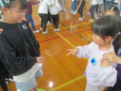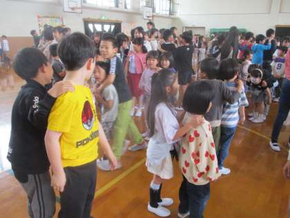 今日は、3時間目に「1年生を迎える会」がありました。1年生は一人ずつ名前を呼んでもらい、元気に返事をしていました。そのあと、1年生から6年生までみんなでゲームをして楽しみました。1年生は「じゃんけん列車」が楽しかったと話す子が多かったです。2年生から6年生までのお兄さんやお姉さんに楽しく、あたたかく迎えてもらえて、大満足の1年生たちでした。