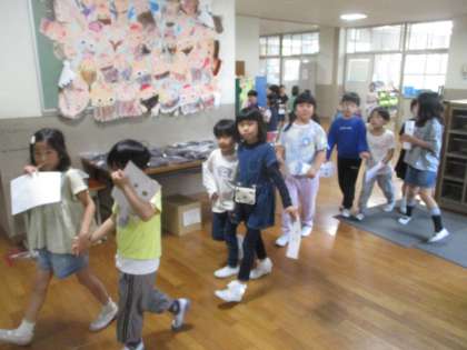 今日は2年生と一緒に、「学校探検」をしました。2年生が校内に用意してくれた特別教室クイズを解いたり、シール集めをしたりしました。2年生の仲良しペアの友達と相談しながら校内のたくさんの教室を回ったことで、学校に詳しくなっただけでなく、とっても仲良くなりました。