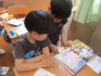 学校探検を終えて、帰ってきた教室の様子です。仲良しペアの2年生と一緒に仲良く本を読んで、みんなの帰りを待っていました!