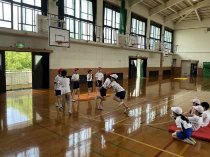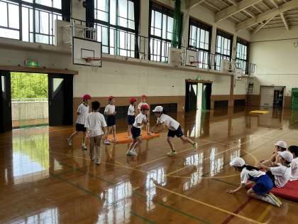 今日の体育では、「すもうあそび」を行いました。「手押し相撲」・「ケンケン相撲」を行いました。子どもたちは、頭を働かせながら体をうまくぶつけたり、よけたりしながら楽しく活動をしていました。