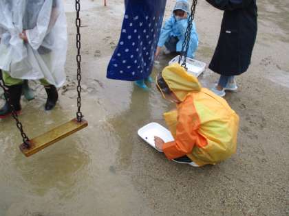 今日は「水の流れと地面の傾きには、どんな関係があるのだろうか。」を調べるために、運動場の雨水が流れた後を観察しに行きました。