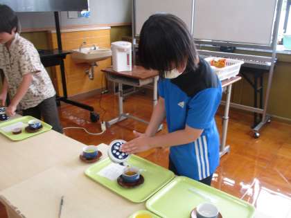 6月7日(土)、休日参観日に「わかばレストラン」の取り組みをしました。1時間目に、ゼリーを作ったりお茶を入れる準備をしたりしました。また、会場の仕上げもしました。準備をしながらみんな「緊張する!」と言ってました。3時間目、開店しました。注文を聞いてゼリーとお茶を運ぶ係とお茶を入れてゼリーを置く係に分かれて仕事をしました。みんな声を掛け合いながらてきぱきと仕事をしていました。保護者や地域の方、教職員などたくさん来ていただき、みんな忙しく動いてました。最後に感想を伝えて終わりました。みんなとても嬉しそうでした。
