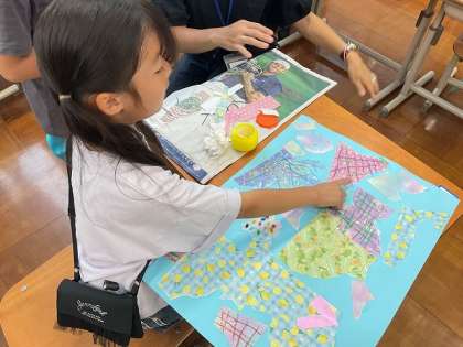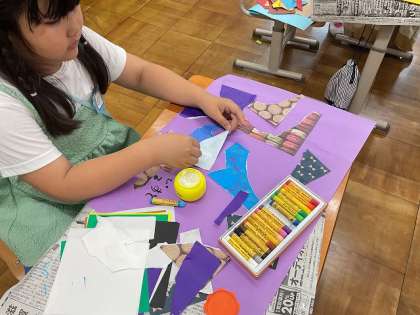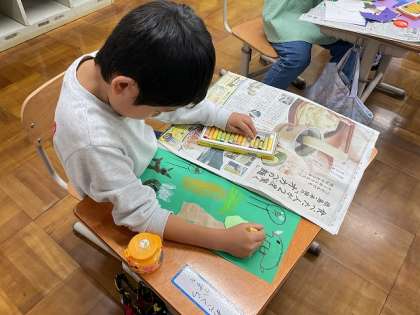 発想ゆたかに、やぶいたかたちを組み合わせたり向きを変えたりして、見立てたかたちから画用紙の世界が広がっていきます。