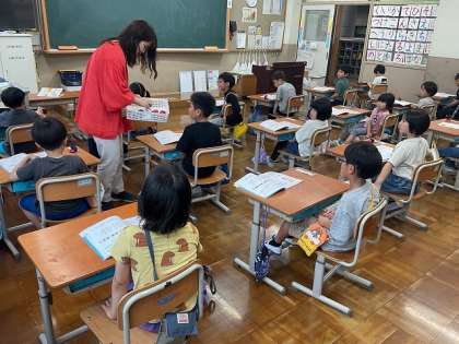 音楽の授業では、「しろくまのジェンカ」でリズム打ちをカスタネットでしました。「曲の感じが楽しそう」と子どもたちが発表していました。