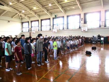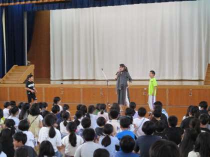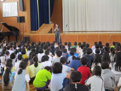 今日の2時間目は、声楽家の橋本妙子さんに来ていただき、声楽体験を全校児童で行いました。