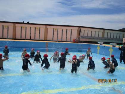 6月13日(金)の3・4校時に、1年生のプール学習がありました。子どもたちは小学校の大きなプールに大喜びでした。