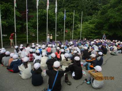 衣笠小学校、下京雅小学校、西京極小学校の3校が一緒に集い合い、それぞれの学校紹介をして交流しました。